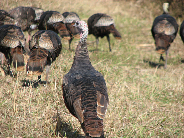 About twenty feet further, as I turned with the pathway, close to two dozen turkeys appeared - no more than twenty feet ahead of me.